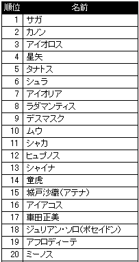 あと他所様で星矢キャラソートの結果を拝見したので、真似してやってみました。ダダ漏れです。10位以内あたりは順列組合せで誰と誰を組み合わせてもイケる予感。